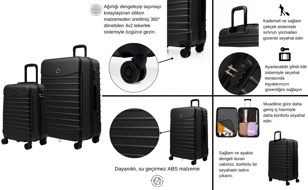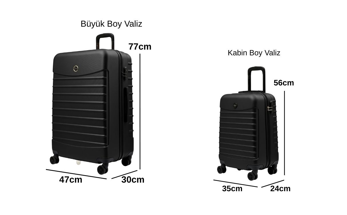 · Büyük Boy Valiz Ölçüleri: Boy: 77 cm, En: 47 cm, Derinlik: 30 cm Ağırlık: 3,8 kg Hacim:100 lt Kapasite: 25 kg