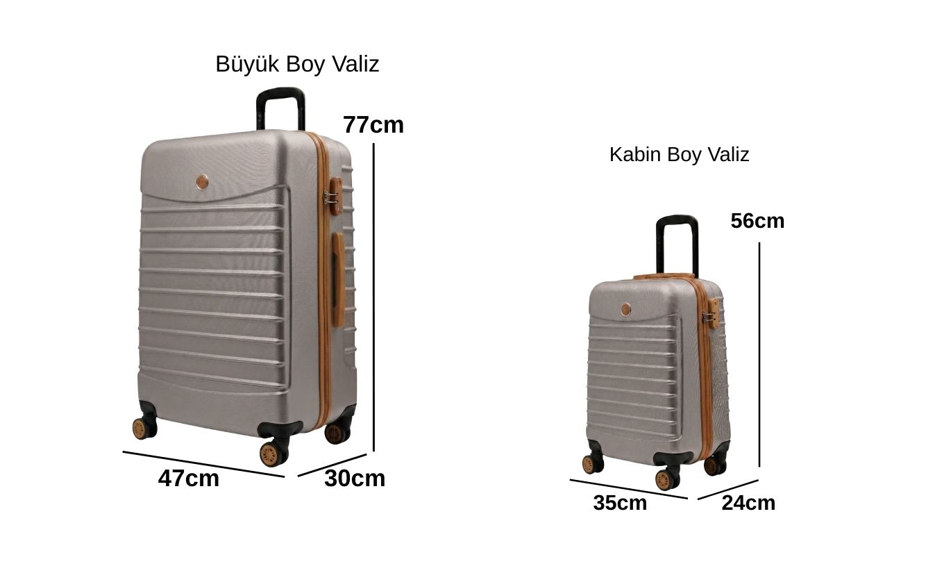 ·         Büyük Boy Valiz Ölçüleri: Boy: 77 cm, En: 47 cm, Derinlik: 30 cm Ağırlık: 3,8 kg Hacim:100 lt Kapasite: 25 kg