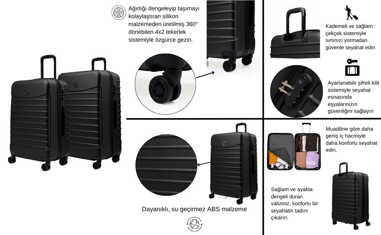 Siyah gövde ve siyah detaylarıyla tasarlanan bu 2’li valiz seti; büyük boy ve orta boy valiz ile birlikte makyaj çantasından oluşur. Kısa ve uzun seyahatlerde ihtiyacınız olan alanı pratik şekilde sunar.
