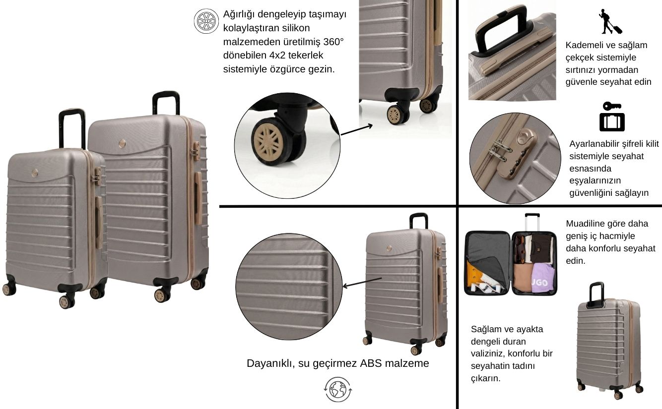 Taş gövde ve bej detaylarıyla tasarlanan bu 2’li valiz seti; büyük boy ve orta boy valiz ile birlikte makyaj çantasından oluşur. Kısa ve uzun seyahatlerde ihtiyacınız olan alanı pratik şekilde sunar.