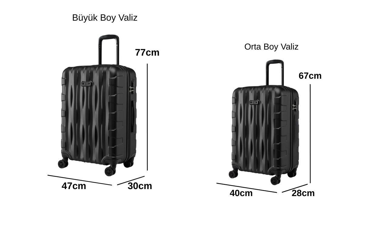 ·         Orta Boy Valiz Ölçüleri: Boy: 67 cm, En: 40 cm, Derinlik: 28 cm Ağırlık: 3,1 kg Hacim:70 lt Kapasite: 20 kg