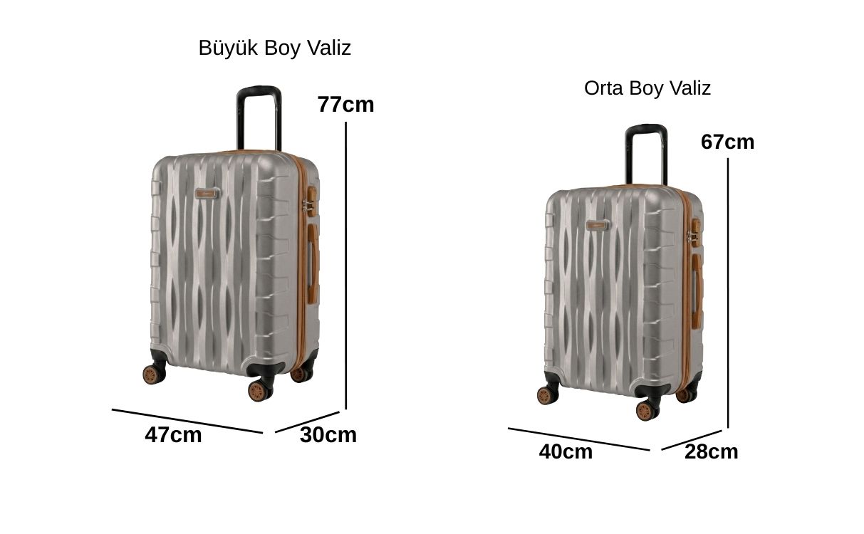 ·         Orta Boy Valiz Ölçüleri: Boy: 67 cm, En: 40 cm, Derinlik: 28 cm Ağırlık: 3,1 kg Hacim:70 lt Kapasite: 20 kg