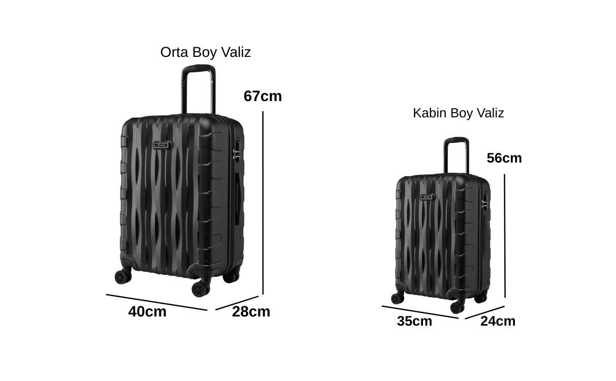 ·         Orta Boy Valiz Ölçüleri: Boy: 67 cm, En: 40 cm, Derinlik: 28 cm Ağırlık: 3,1 kg Hacim:70 lt Kapasite: 20 kg