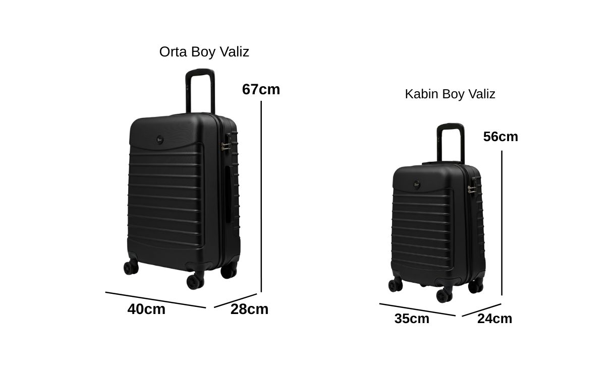 · Orta Boy Valiz Ölçüleri: Boy: 67 cm, En: 40 cm, Derinlik: 28 cm Ağırlık: 3,1 kg Hacim:70 lt Kapasite: 20 kg