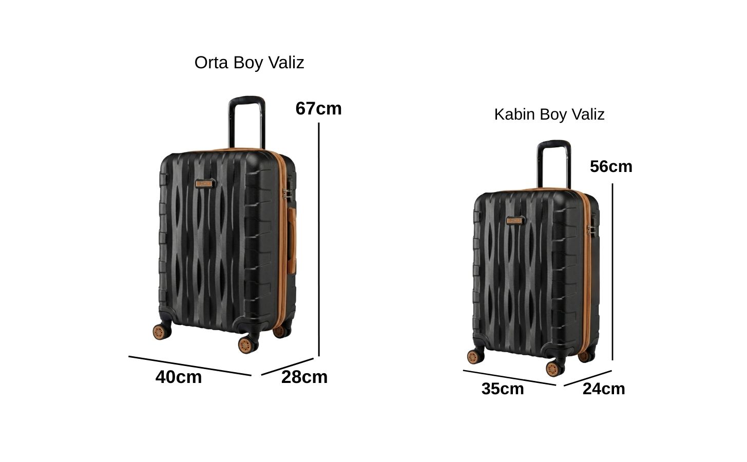 ·         Orta Boy Valiz Ölçüleri: Boy: 67 cm, En: 40 cm, Derinlik: 28 cm Ağırlık: 3,1 kg Hacim:70 lt Kapasite: 20 kg