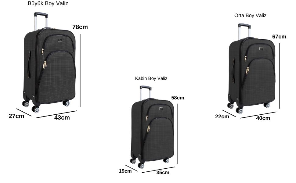 Orta Boy Valiz: Boy x En x Derinlik: 67 x 40 x 22cm Ağırlığı: 3,6 kg