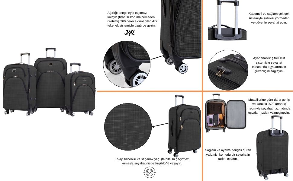 Louisiana Polo antrasit 3’lü valiz seti, farklı seyahat ihtiyaçlarına uygun büyük, orta ve kabin boy valiz seçenekleri ile pratik ve şık bir kullanım sunar. Dayanıklı kumaş gövdesi, geniş iç hacmi ve 360° dönebilen tekerlek sistemi sayesinde seyahatlerinizde konfor sağlar. Hafif ve ergonomik tasarımı ile uçak, otobüs ve uzun yolculuklar için ideal bir bavul setidir.
