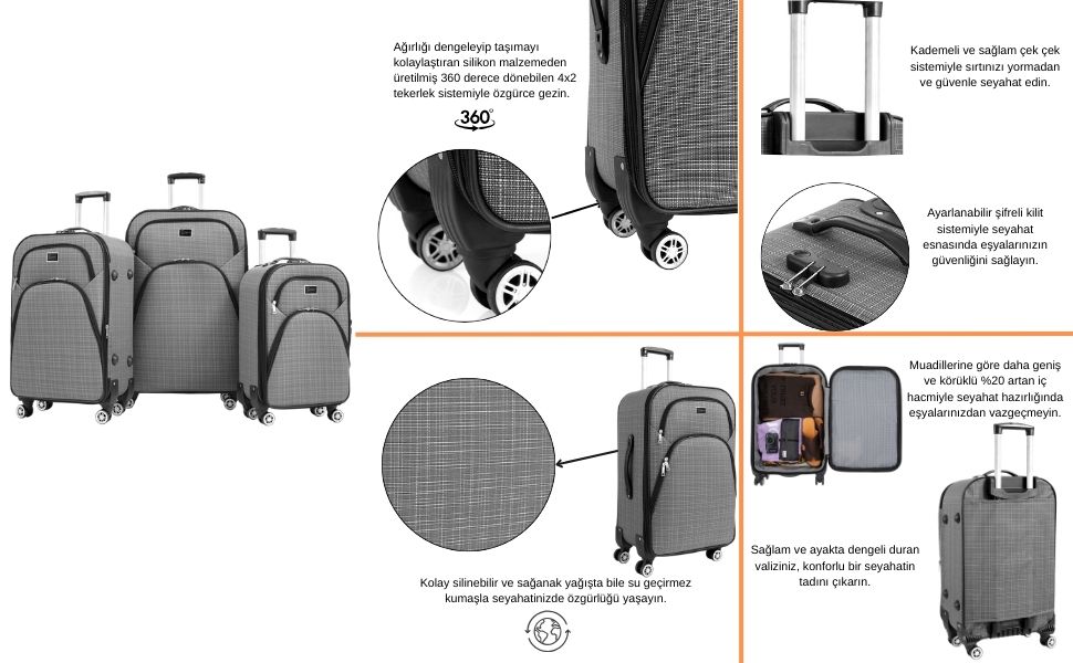 • Marka: Louisiana Polo• Set İçeriği: Büyük Boy + Orta Boy + Kabin Boy Valiz• Renk: Gri• Dayanıklı kumaş gövde yapısı• 360° dönebilen sessiz tekerlek sistemi• Ergonomik teleskopik çekçek sistemi• Geniş iç hacim ve düzenleyici bölmeler• Uzun ve kısa seyahatler için ideal kullanım• Hafif ve kullanışlı tasarım