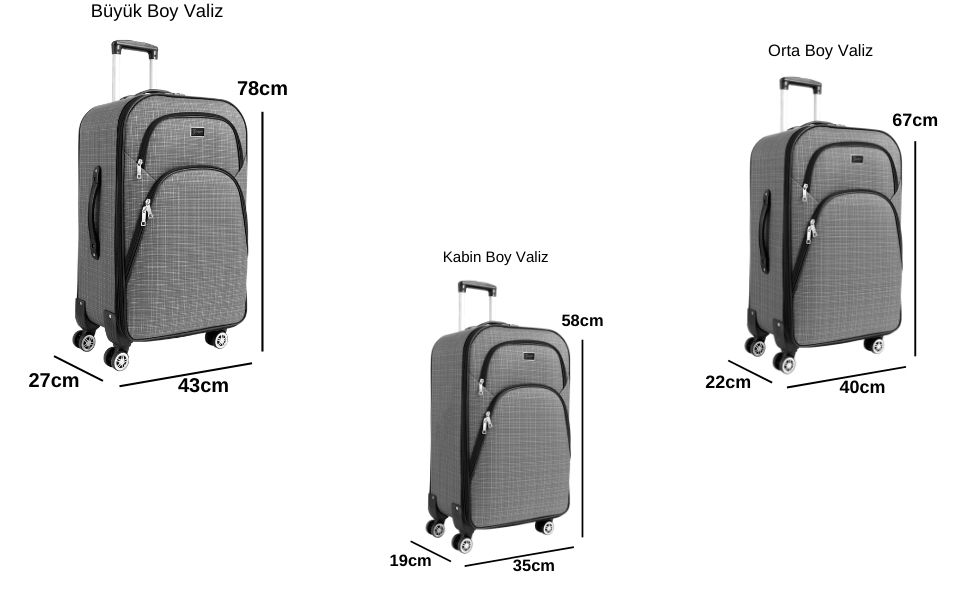 Orta Boy Valiz: Boy x En x Derinlik: 67 x 40 x 22cm Ağırlığı: 3,6 kg