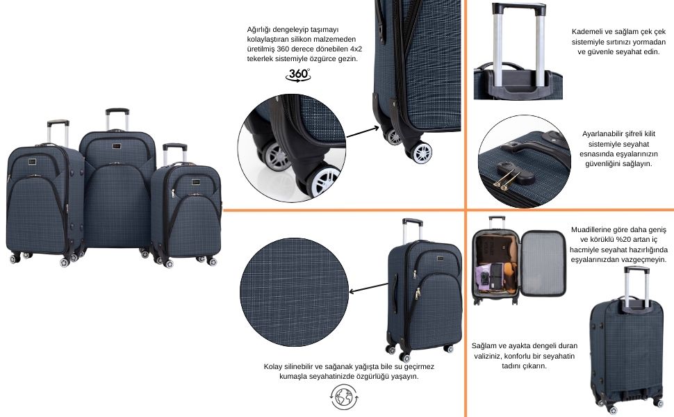 Louisiana Polo lacivert 3’lü valiz seti, farklı seyahat ihtiyaçlarına uygun büyük, orta ve kabin boy valiz seçenekleri ile pratik ve şık bir kullanım sunar. Dayanıklı kumaş gövdesi, geniş iç hacmi ve 360° dönebilen tekerlek sistemi sayesinde seyahatlerinizde konfor sağlar. Hafif ve ergonomik tasarımı ile uçak, otobüs ve uzun yolculuklar için ideal bir bavul setidir.