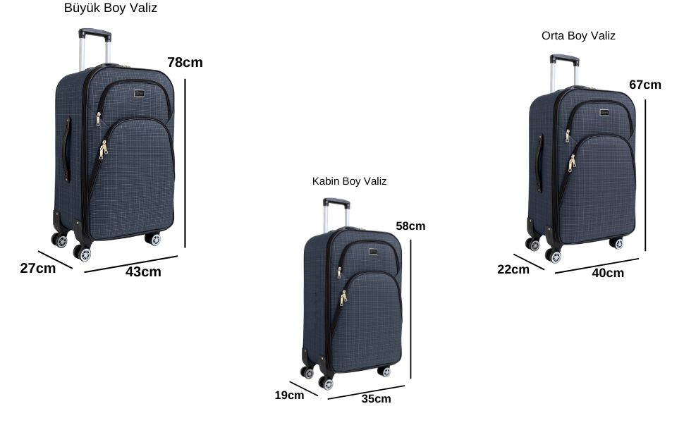 Kabin Boy Valiz: Boy x En x Derinlik: 58 x 35 x 19cm Ağırlığı: 2,9 kg
