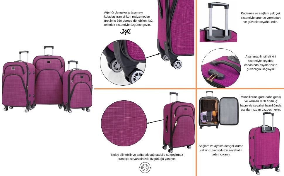 • Marka: Louisiana Polo• Set İçeriği: Büyük Boy + Orta Boy + Kabin Boy Valiz• Renk: Pembe• Dayanıklı kumaş gövde yapısı• 360° dönebilen sessiz tekerlek sistemi• Ergonomik teleskopik çekçek sistemi• Geniş iç hacim ve düzenleyici bölmeler• Uzun ve kısa seyahatler için ideal kullanım• Hafif ve kullanışlı tasarım