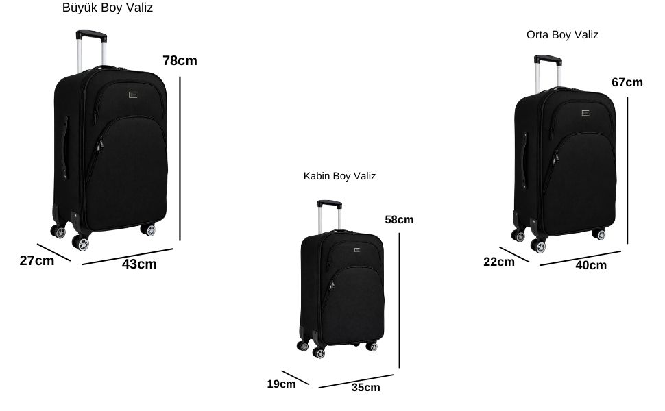 Orta Boy Valiz: Boy x En x Derinlik: 67 x 40 x 22cm Ağırlığı: 3,6 kg