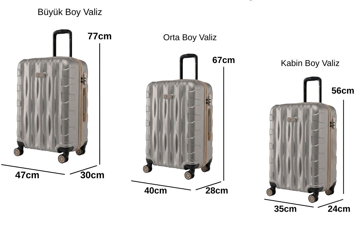 ·         Orta Boy Valiz Ölçüleri: Boy: 67 cm, En: 40 cm, Derinlik: 28 cm Ağırlık: 3,1 kg Hacim:70 lt Kapasite: 20 kg