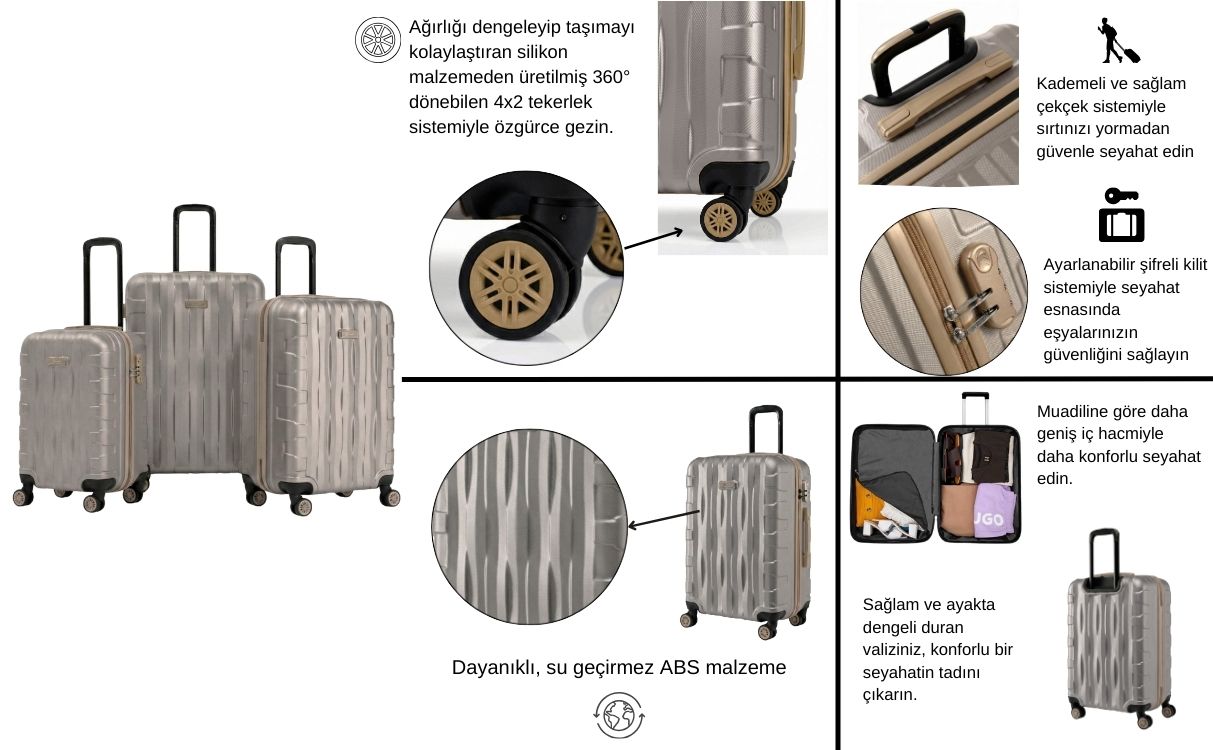 Bu valizin geniş iç alanı, tüm eşyalarınızı kolayca düzenlemenizi sağlar.  Şifreli kilit mekanizması ile eşyalarınız her zaman güvende. Her bütçeye uygun, "ucuz valiz" arayışınızda, kaliteden ödün vermeden ihtiyacınızı karşılayacak bu set, uzun ömürlü bir kullanım sağlayacaktır.​