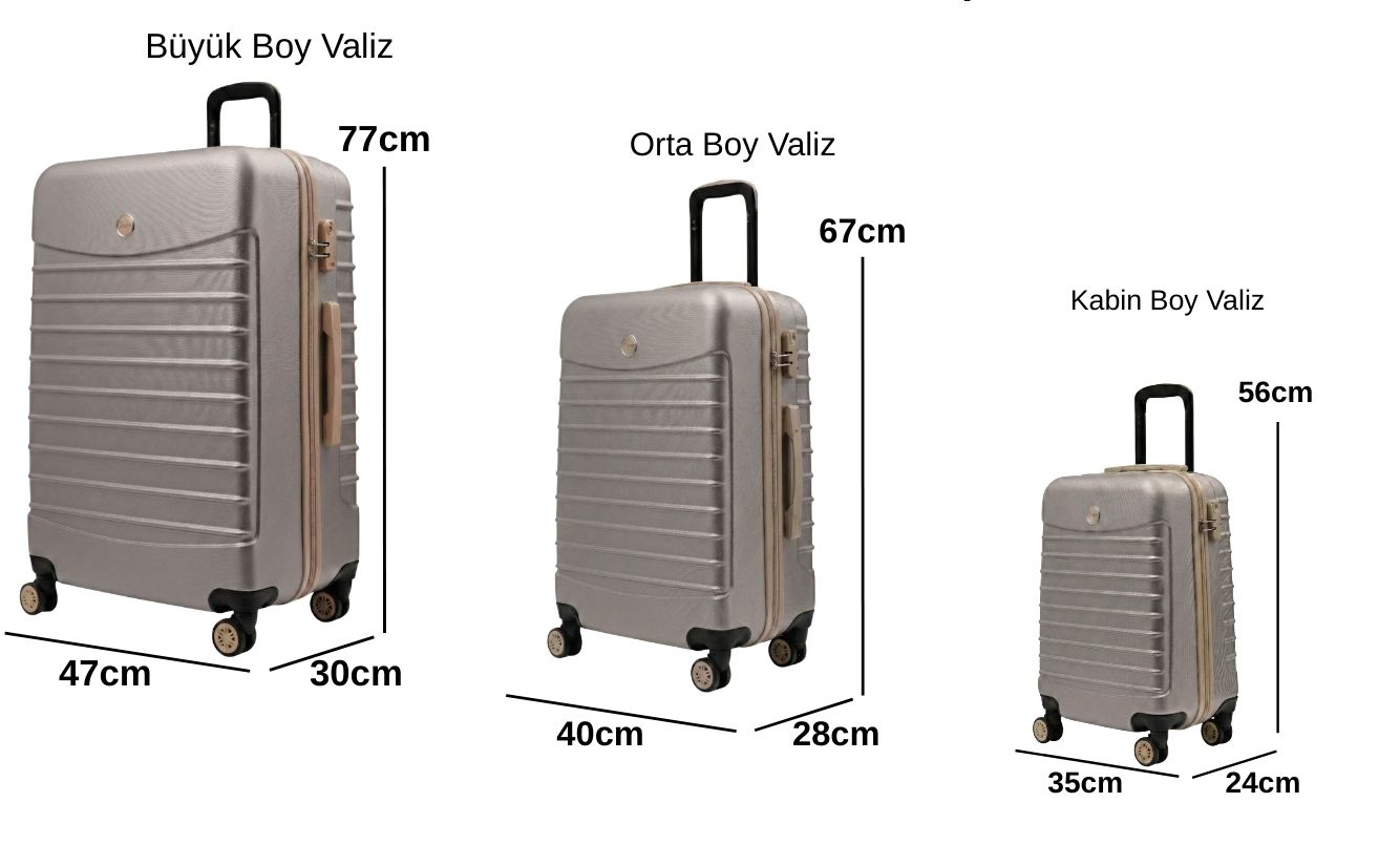 · Büyük Boy Valiz Ölçüleri: Boy: 77 cm, En: 47 cm, Derinlik: 30 cm Ağırlık: 3,8 kg Hacim:100 lt Kapasite: 25 kg