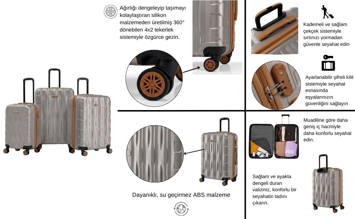 Bu valizin geniş iç alanı, tüm eşyalarınızı kolayca düzenlemenizi sağlar.  Şifreli kilit mekanizması ile eşyalarınız her zaman güvende. Her bütçeye uygun, "ucuz valiz" arayışınızda, kaliteden ödün vermeden ihtiyacınızı karşılayacak bu set, uzun ömürlü bir kullanım sağlayacaktır.​​