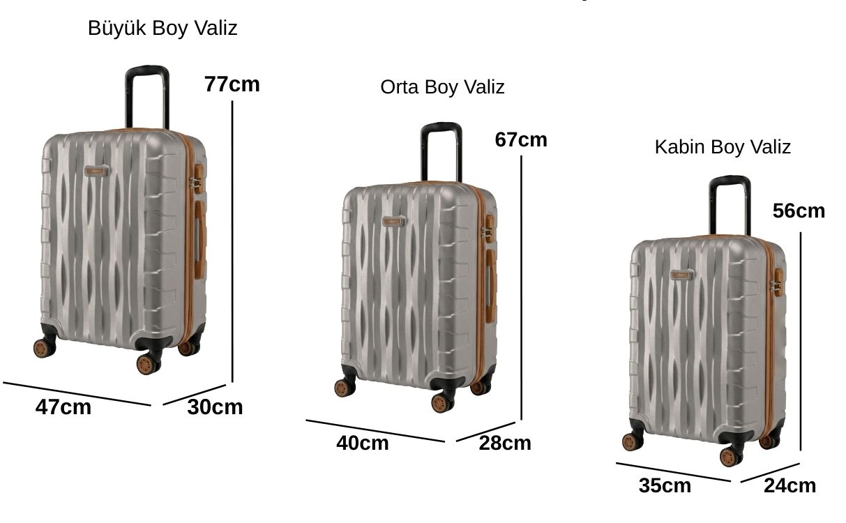 ·         Orta Boy Valiz Ölçüleri: Boy: 67 cm, En: 40 cm, Derinlik: 28 cm Ağırlık: 3,1 kg Hacim:70 lt Kapasite: 20 kg