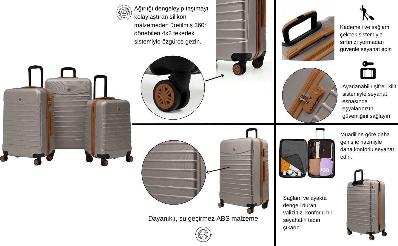 Taş gövde ve taba detaylarıyla tasarlanan bu 4’lü valiz seti; büyük boy, orta boy ve kabin boy valiz ile birlikte makyaj çantasından oluşur. Kısa ve uzun seyahatlerde ihtiyacınız olan alanı pratik şekilde sunar.
