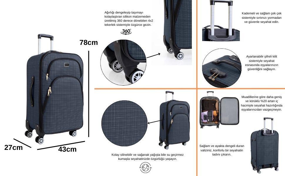Büyük Boy Valiz: Boy x En x Derinlik: 78 x 43 x 27cm Ağırlığı: 4,2 kg