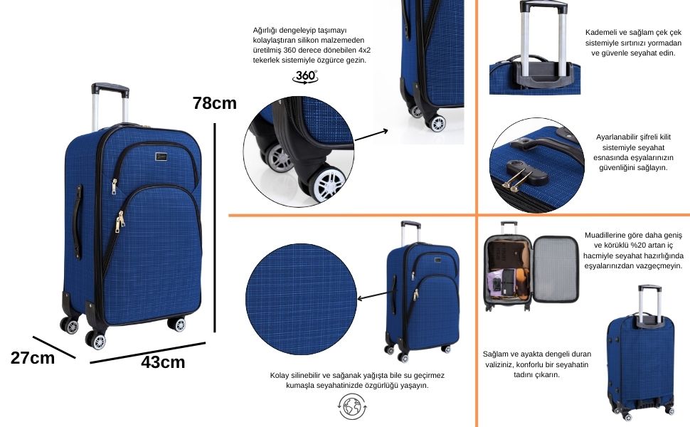 Büyük Boy Valiz: Boy x En x Derinlik: 78 x 43 x 27cm Ağırlığı: 4,2 kg