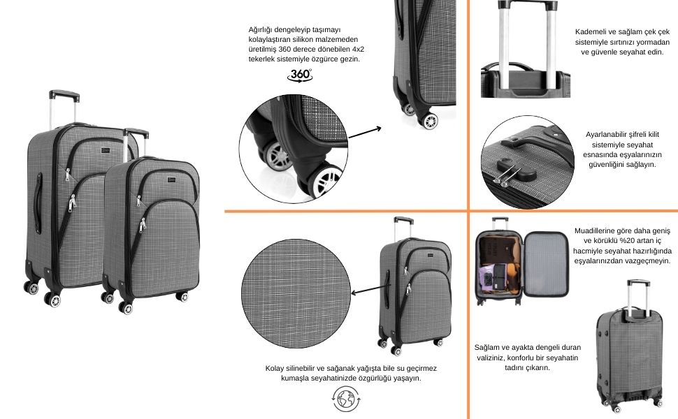 Louisiana Polo gri 2'li valiz seti, farklı seyahat ihtiyaçlarına uygun büyük ve kabin boy valiz seçenekleri ile pratik ve şık bir kullanım sunar. Dayanıklı kumaş gövdesi, geniş iç hacmi ve 360° dönebilen tekerlek sistemi sayesinde seyahatlerinizde konfor sağlar. Hafif ve ergonomik tasarımı ile uçak, otobüs ve uzun yolculuklar için ideal bir bavul setidir.
