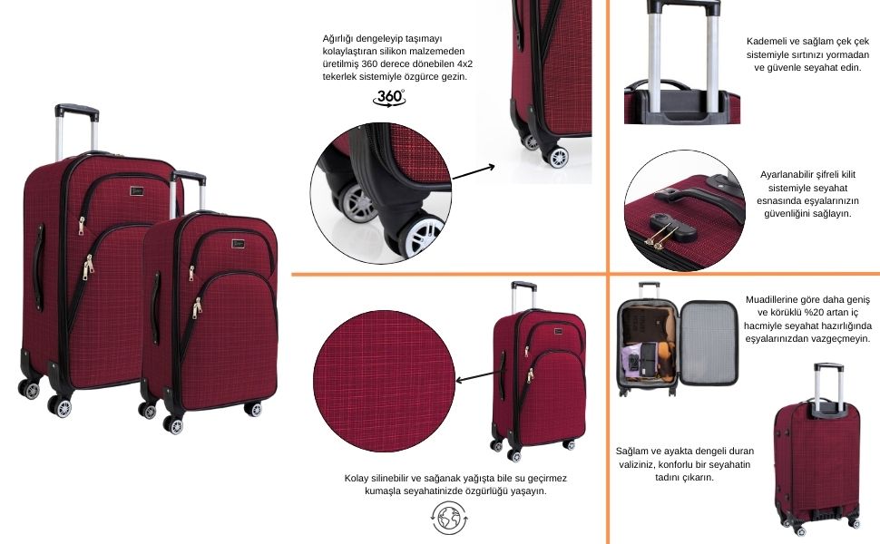 Louisiana Polo bordo 2'li valiz seti, farklı seyahat ihtiyaçlarına uygun büyük ve orta boy valiz seçenekleri ile pratik ve şık bir kullanım sunar. Dayanıklı kumaş gövdesi, geniş iç hacmi ve 360° dönebilen tekerlek sistemi sayesinde seyahatlerinizde konfor sağlar. Hafif ve ergonomik tasarımı ile uçak, otobüs ve uzun yolculuklar için ideal bir bavul setidir.