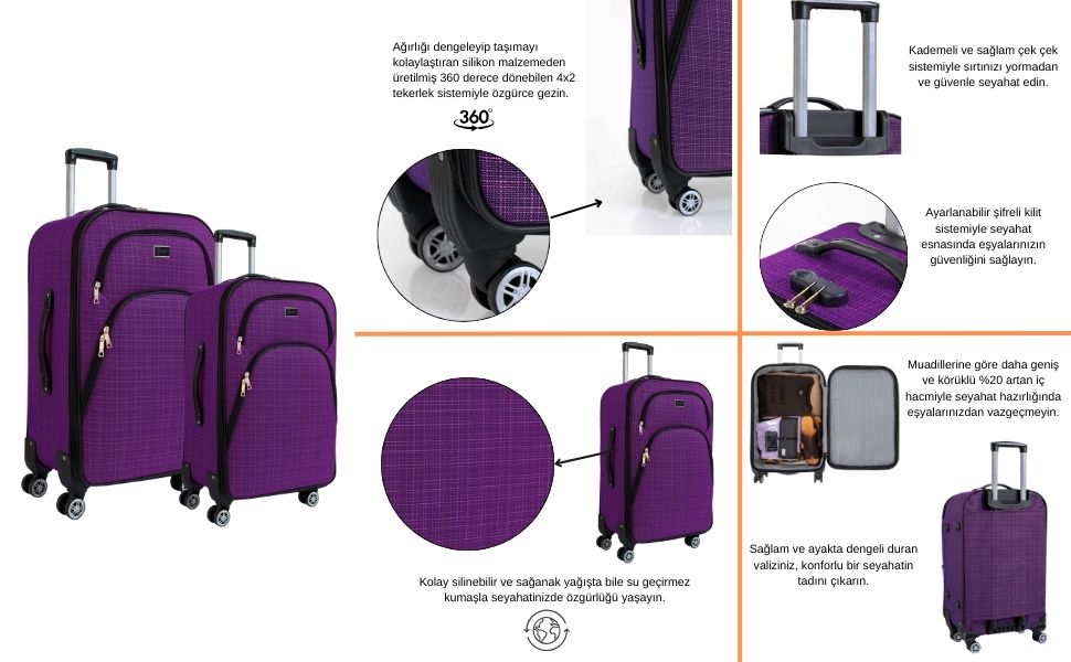 Louisiana Polo mor 2'li valiz seti, farklı seyahat ihtiyaçlarına uygun büyük ve orta boy valiz seçenekleri ile pratik ve şık bir kullanım sunar. Dayanıklı kumaş gövdesi, geniş iç hacmi ve 360° dönebilen tekerlek sistemi sayesinde seyahatlerinizde konfor sağlar. Hafif ve ergonomik tasarımı ile uçak, otobüs ve uzun yolculuklar için ideal bir bavul setidir.