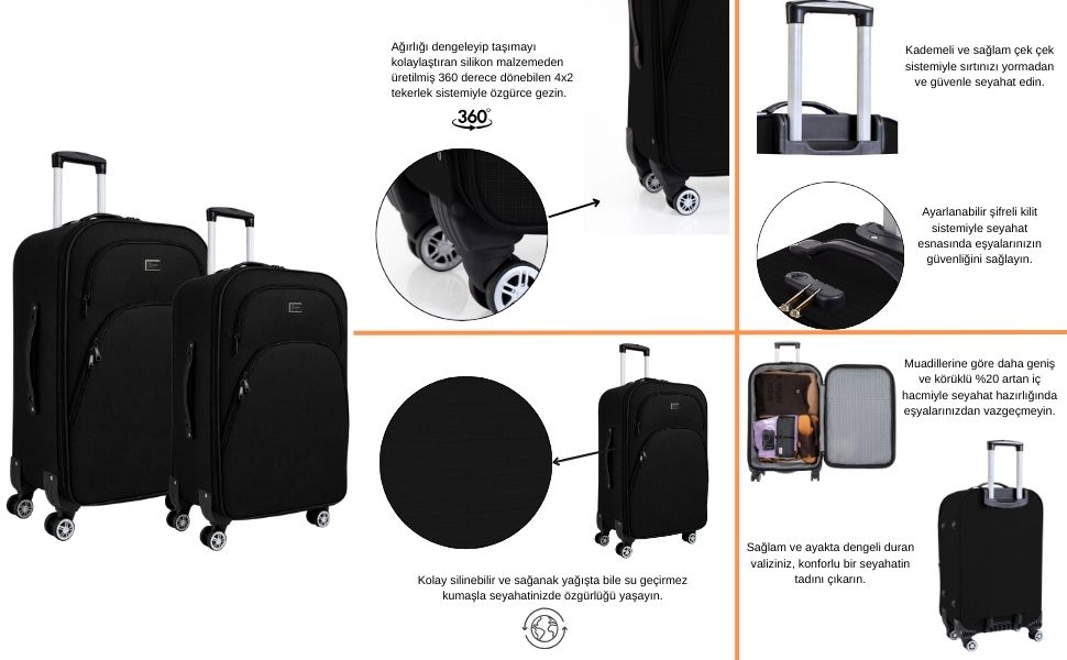 Louisiana Polo siyah 2'li valiz seti, farklı seyahat ihtiyaçlarına uygun büyük ve orta boy valiz seçenekleri ile pratik ve şık bir kullanım sunar. Dayanıklı kumaş gövdesi, geniş iç hacmi ve 360° dönebilen tekerlek sistemi sayesinde seyahatlerinizde konfor sağlar. Hafif ve ergonomik tasarımı ile uçak, otobüs ve uzun yolculuklar için ideal bir bavul setidir.