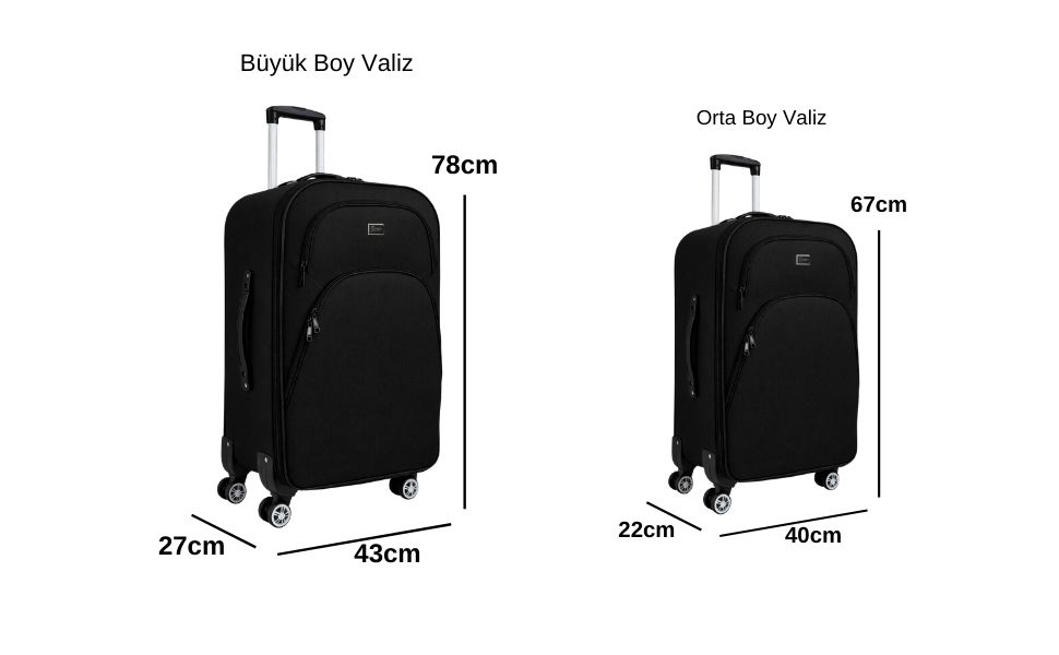 Orta Boy Valiz: Boy x En x Derinlik: 67 x 40 x 22cm Ağırlığı: 3,6 kg