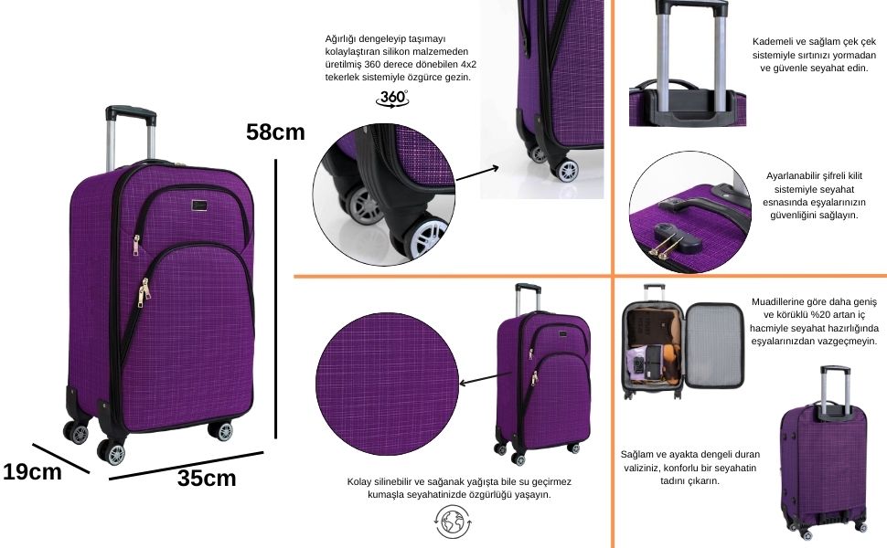 Kabin Boy Valiz: Boy x En x Derinlik: 58 x 35 x 19cm Ağırlığı: 2,9 kg