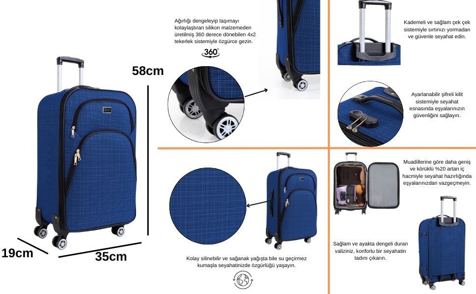 Kabin Boy Valiz: Boy x En x Derinlik: 58 x 35 x 19cm Ağırlığı: 2,9 kg