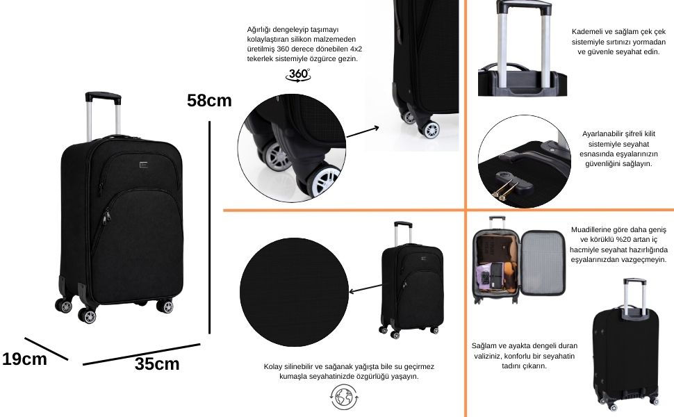 Kabin Boy Valiz: Boy x En x Derinlik: 58 x 35 x 19cm Ağırlığı: 2,9 kg