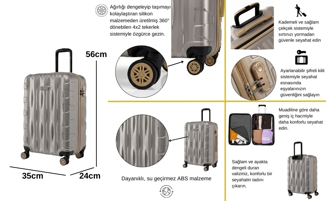 · Kabin Boy Valiz Ölçüleri: Boy: 56 cm, En: 35 cm, Derinlik: 24 cm Ağırlık: 2,5 kg Hacim:37 lt Kapasite: 10 kg