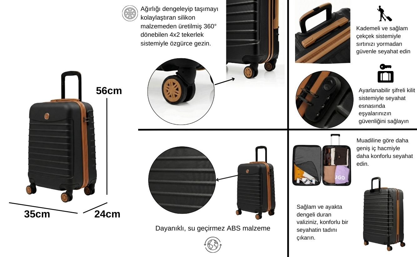Siyah gövde ve taba detaylarıyla tasarlanan bu valiz; kabin boy valiz ile birlikte makyaj çantasından oluşur. Kısa ve uzun seyahatlerde ihtiyacınız olan alanı pratik şekilde sunar.