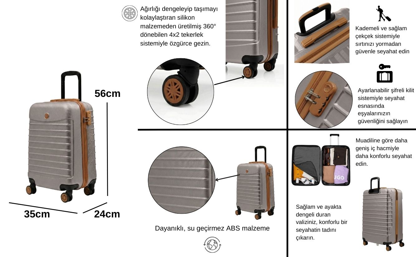Taş gövde ve taba detaylarıyla tasarlanan bu valiz; kabin boy valiz ile birlikte makyaj çantasından oluşur. Kısa ve uzun seyahatlerde ihtiyacınız olan alanı pratik şekilde sunar.