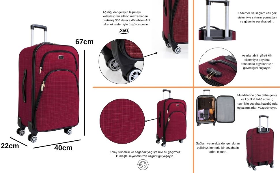 Orta Boy Valiz: Boy x En x Derinlik: 67 x 40 x 22cm Ağırlığı: 3,6 kg