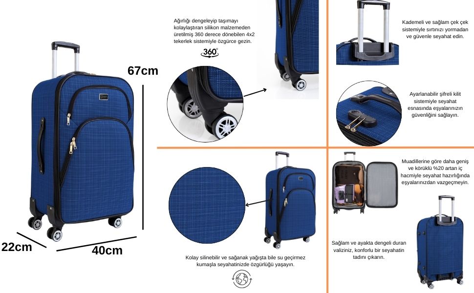 Orta Boy Valiz: Boy x En x Derinlik: 67 x 40 x 22cm Ağırlığı: 3,6 kg