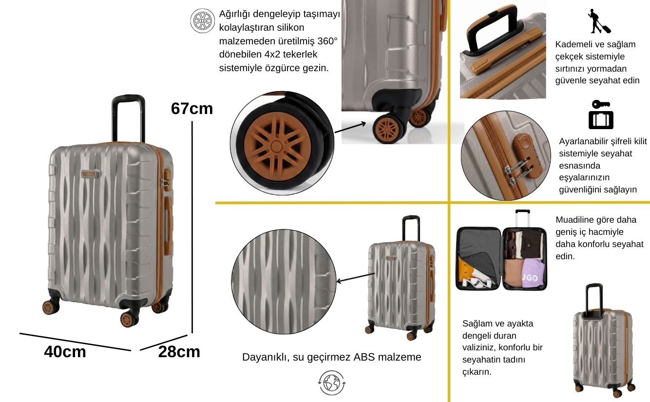 · Orta Boy Valiz Ölçüleri: Boy: 67 cm, En: 40 cm, Derinlik: 28 cm Ağırlık: 3,1 kg Hacim:70 lt Kapasite: 20 kg