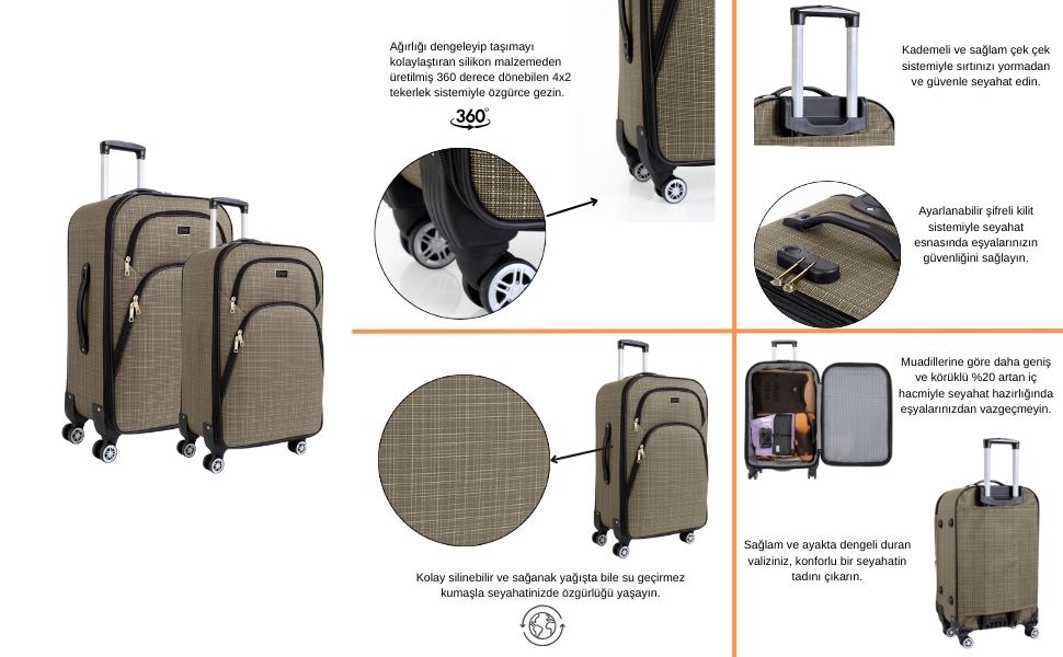 Louisiana Polo Bej 2'li valiz seti, farklı seyahat ihtiyaçlarına uygun orta ve kabin boy valiz seçenekleri ile pratik ve şık bir kullanım sunar. Dayanıklı kumaş gövdesi, geniş iç hacmi ve 360° dönebilen tekerlek sistemi sayesinde seyahatlerinizde konfor sağlar. Hafif ve ergonomik tasarımı ile uçak, otobüs ve uzun yolculuklar için ideal bir bavul setidir.