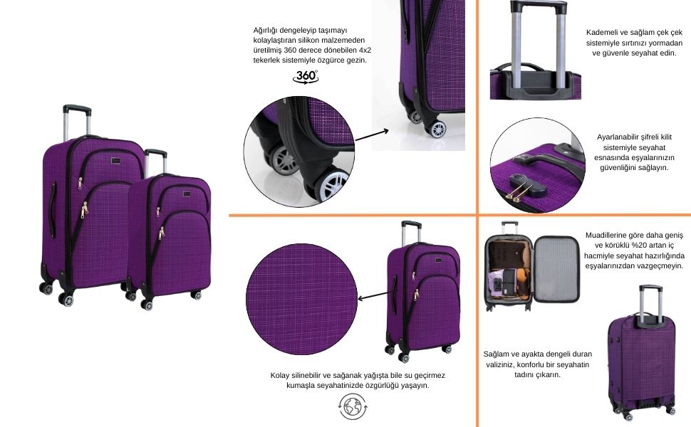 Louisiana Polo mor 2'li valiz seti, farklı seyahat ihtiyaçlarına uygun orta ve kabin boy valiz seçenekleri ile pratik ve şık bir kullanım sunar. Dayanıklı kumaş gövdesi, geniş iç hacmi ve 360° dönebilen tekerlek sistemi sayesinde seyahatlerinizde konfor sağlar. Hafif ve ergonomik tasarımı ile uçak, otobüs ve uzun yolculuklar için ideal bir bavul setidir.