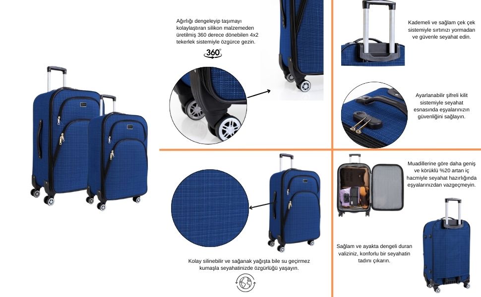 Louisiana Polo saks mavi 2'li valiz seti, farklı seyahat ihtiyaçlarına uygun orta ve kabin boy valiz seçenekleri ile pratik ve şık bir kullanım sunar. Dayanıklı kumaş gövdesi, geniş iç hacmi ve 360° dönebilen tekerlek sistemi sayesinde seyahatlerinizde konfor sağlar. Hafif ve ergonomik tasarımı ile uçak, otobüs ve uzun yolculuklar için ideal bir bavul setidir.
